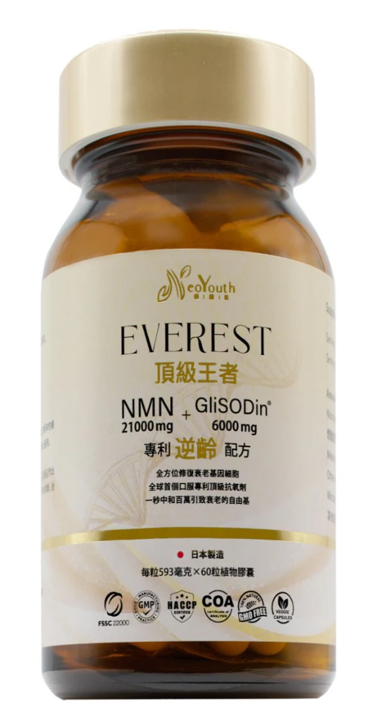 日本NeoYouth美康萊EVEREST頂級王者匯聚現代抗衰老科研的結晶品,結合NMNβ-煙醯胺單核苷酸以及GliSODin®法國專利蜜瓜萃取「超級酵素SOD」,研製出現有最頂尖的逆齡魔法,讓體魄維持頂峰水平。